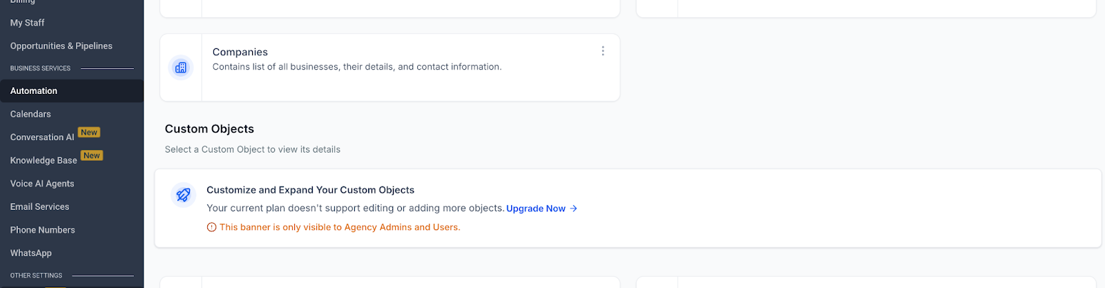 - Upsell Banner for Account Users: A new banner displays pricing and upgrade info for Custom Objects, visible to allaccount users and admins.