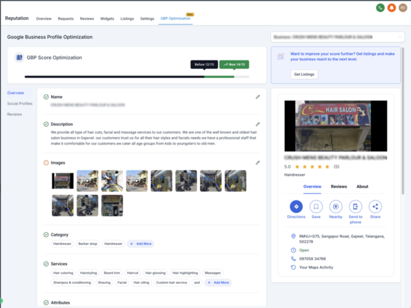 Update essential profile details — from business name and phone number to images, services, and attributes — without leaving the Reputation tab.Live Preview: